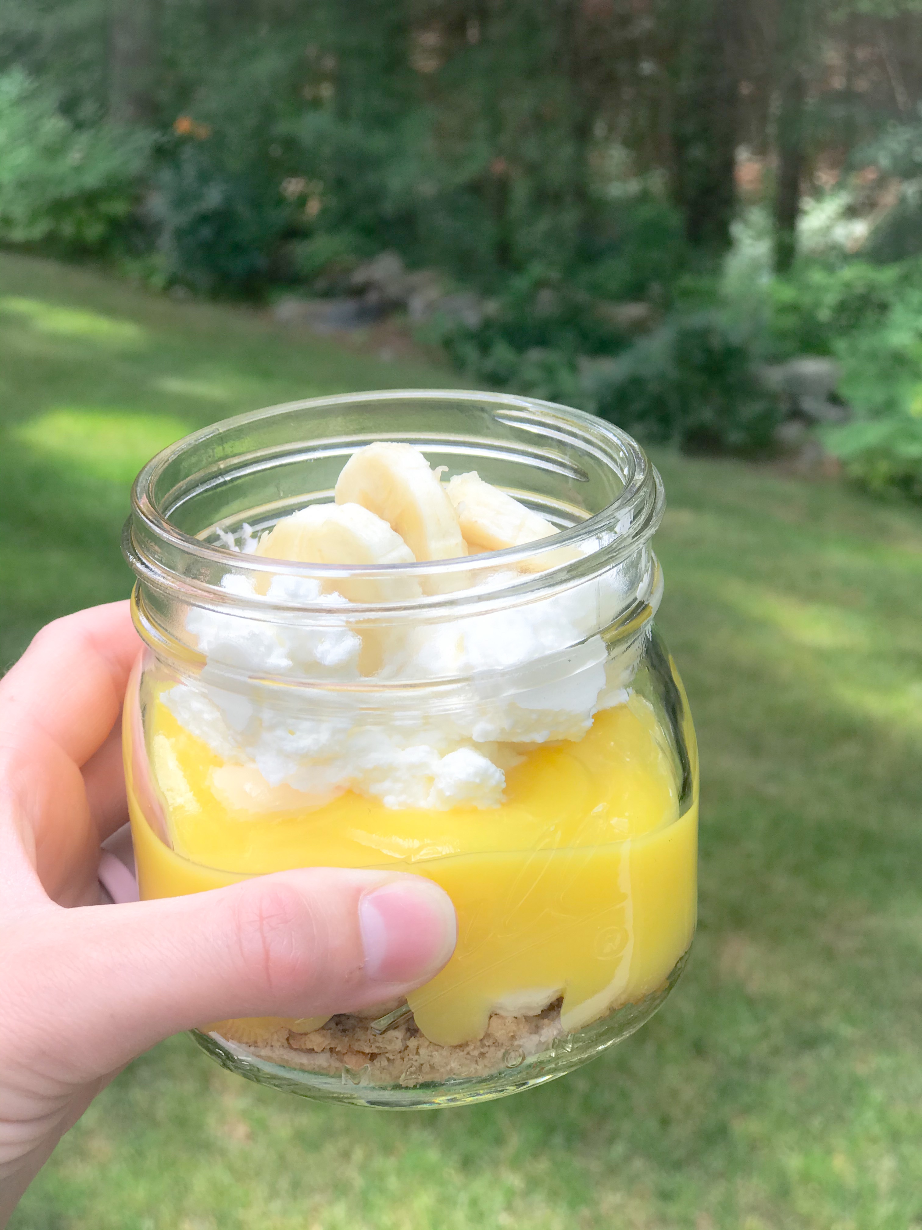 - Pour cold milk into a bowl and add vanilla pudding powder. Whisk for 1-2 minutes until smooth. Pour pudding mixture into jars over graham cracker bottom.