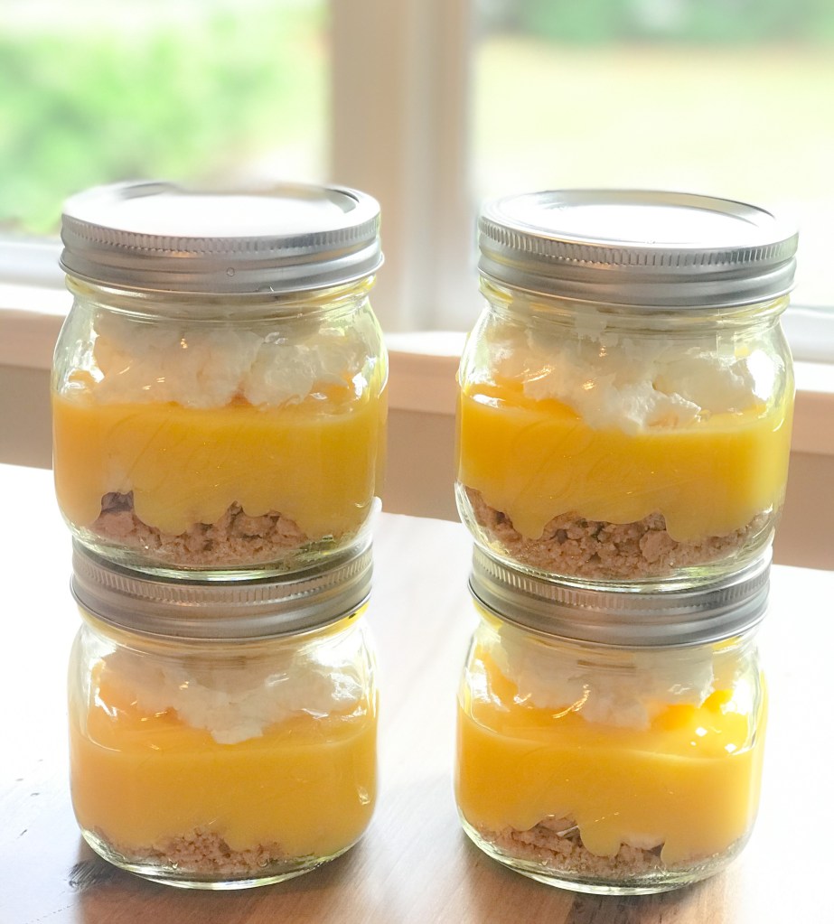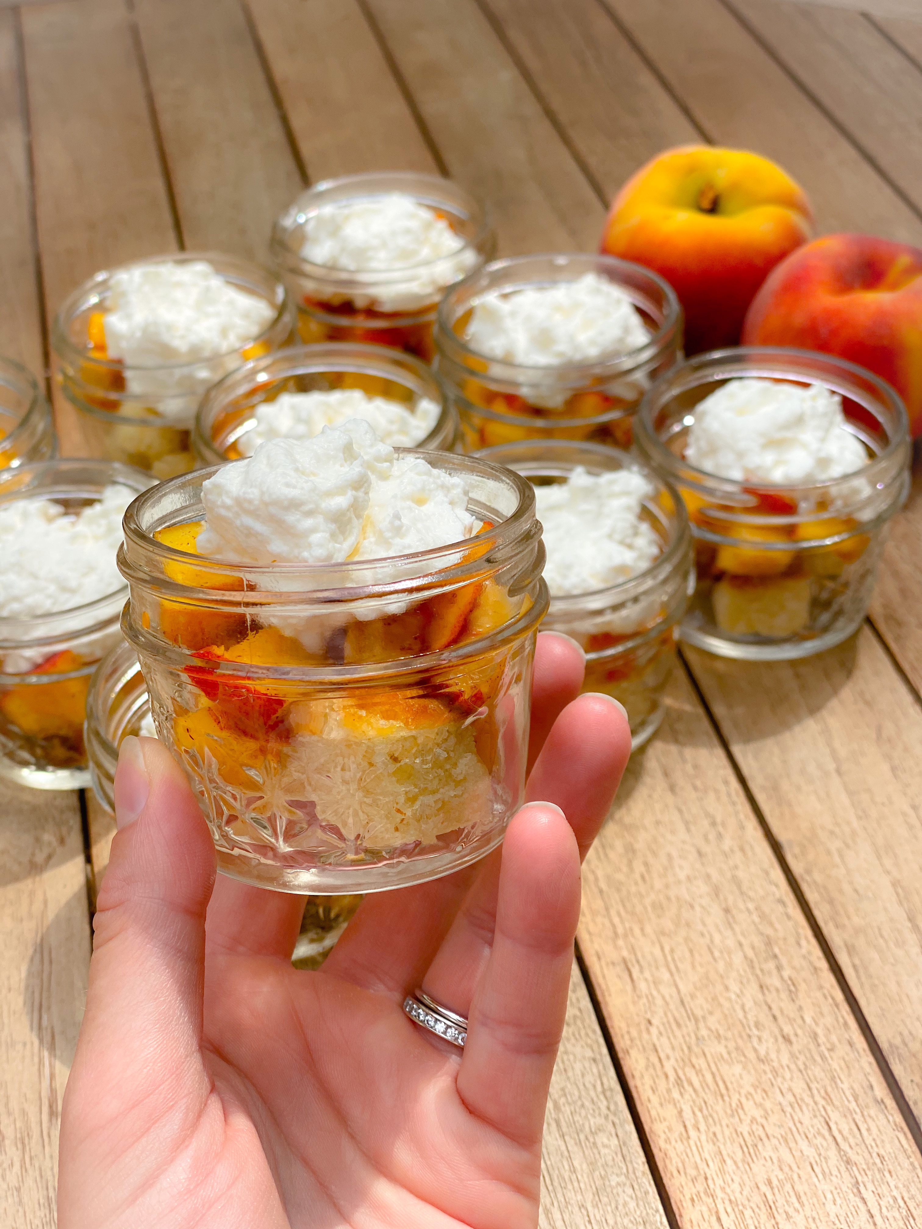 - Cube pound/angel food cake and arrange a layer at the bottom of your jar. Add peach mixture followed by whipped cream mixture.