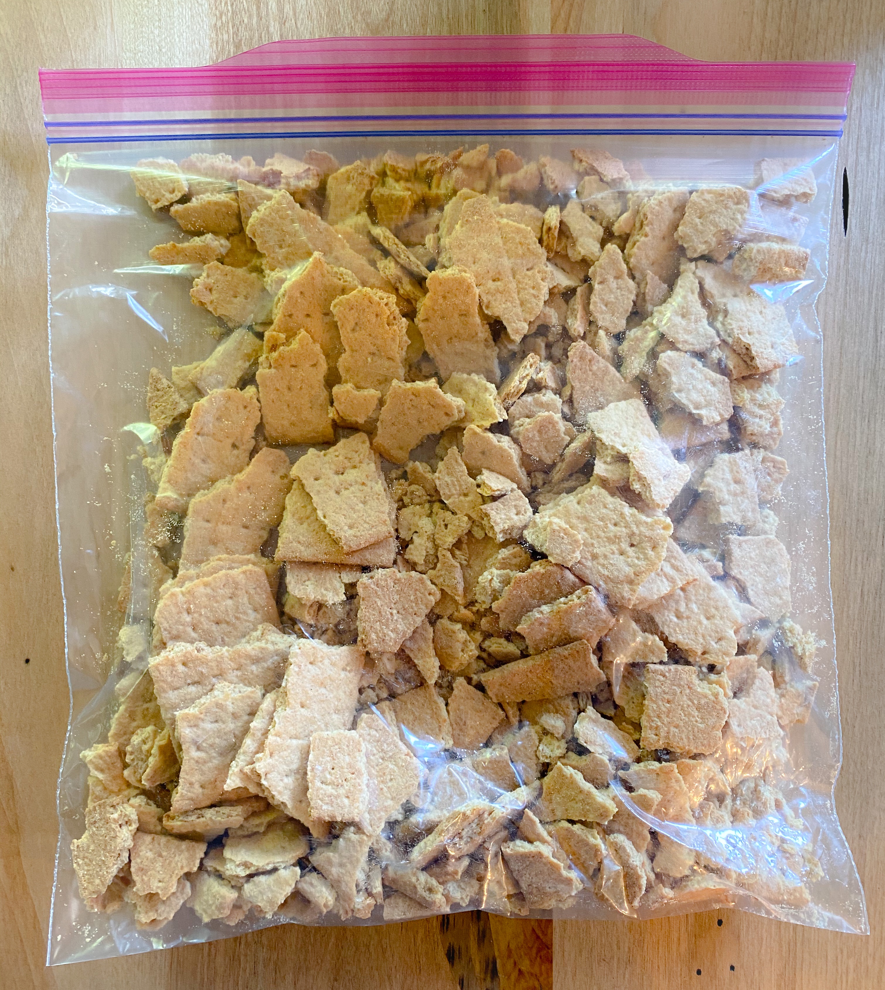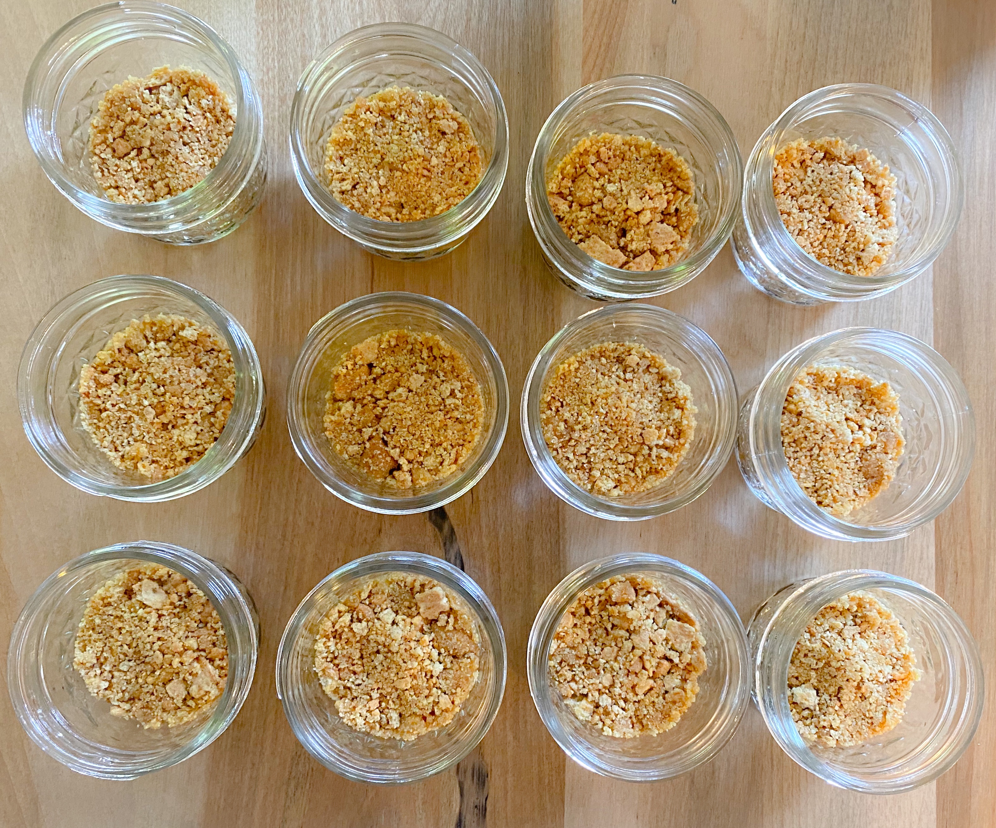 - Place graham crackers in a plastic gallon size bag and crush until fine (I used the bottom of a jar). Dump crushed crackers into a bowl and mix with granulated sugar. Once combined, add melted butter and mix until cracker mixer begins to stick together.. it will still be crumbly. Scoop graham cracker mixture into the bottom of jars and pat down using a spoon.