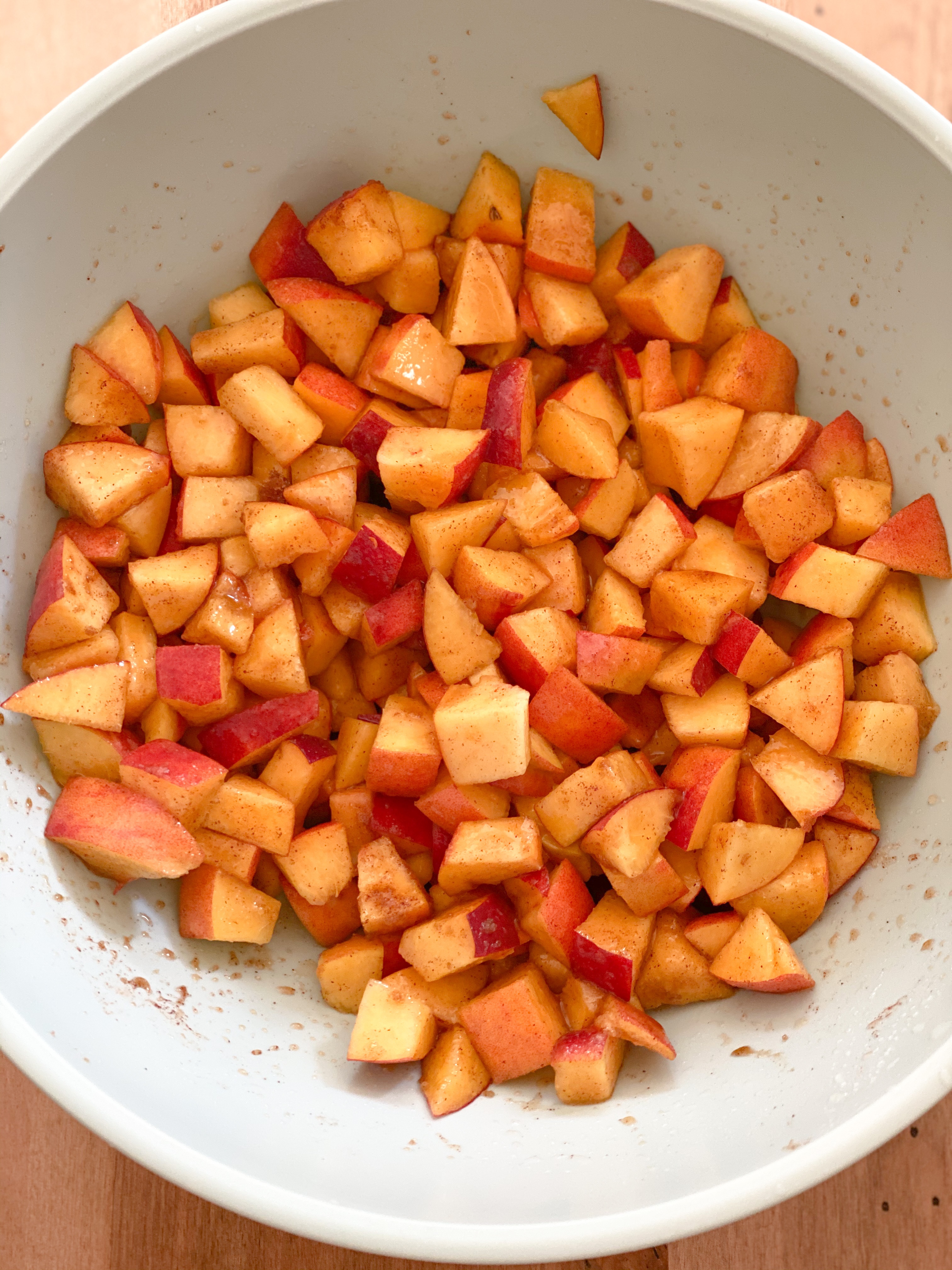 - Wash and chop peaches to slightly smaller than bite size. In a bowl, combine peaches, cinnamon, granulated sugar, brown sugar and lemon juice. Allow to sit for 20 minutes.