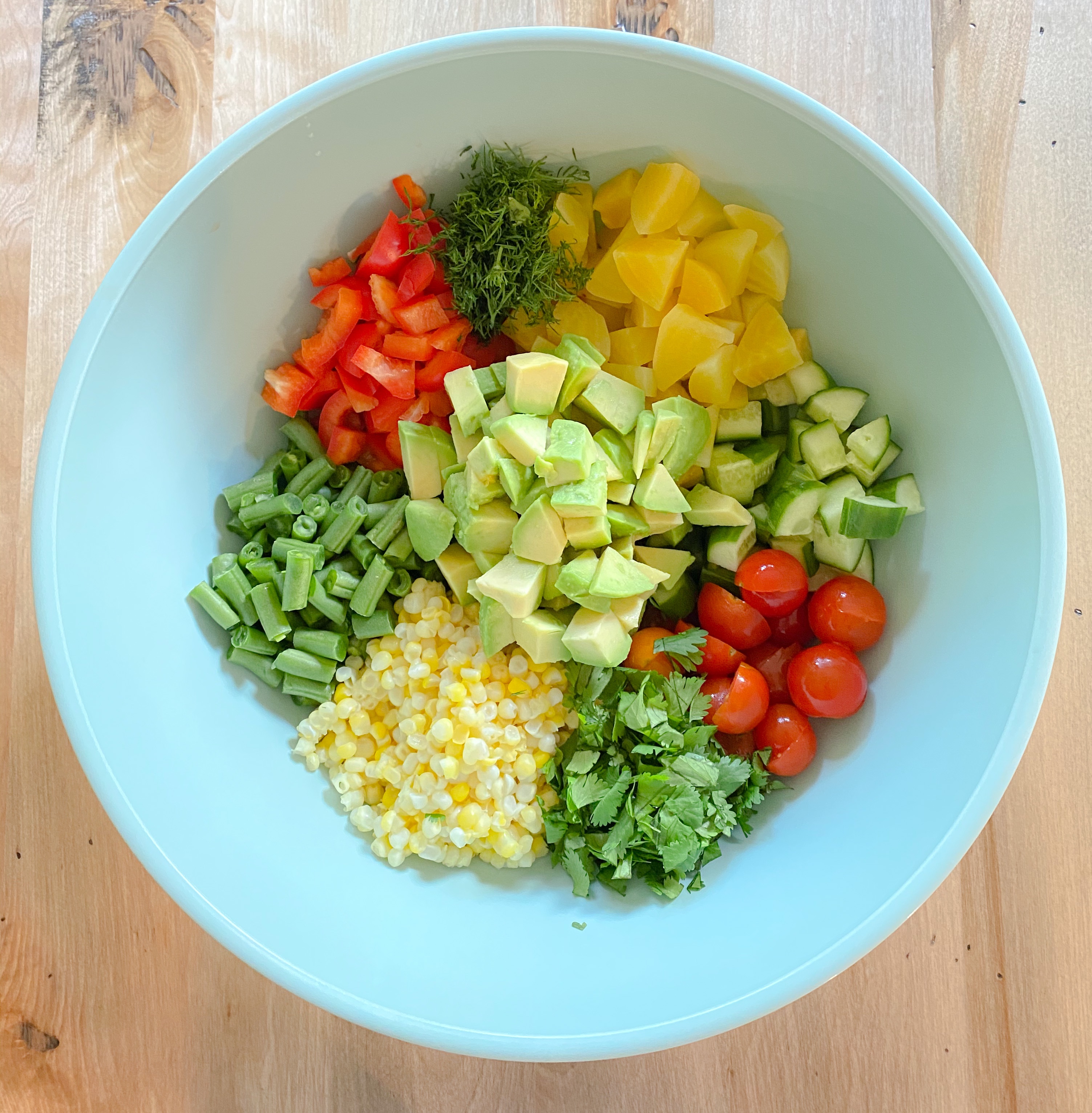 - While corn and beets are cooking, chop tomatoes, cucumber, avocado, green beans and pepper into bite size pieces and add to bowl.