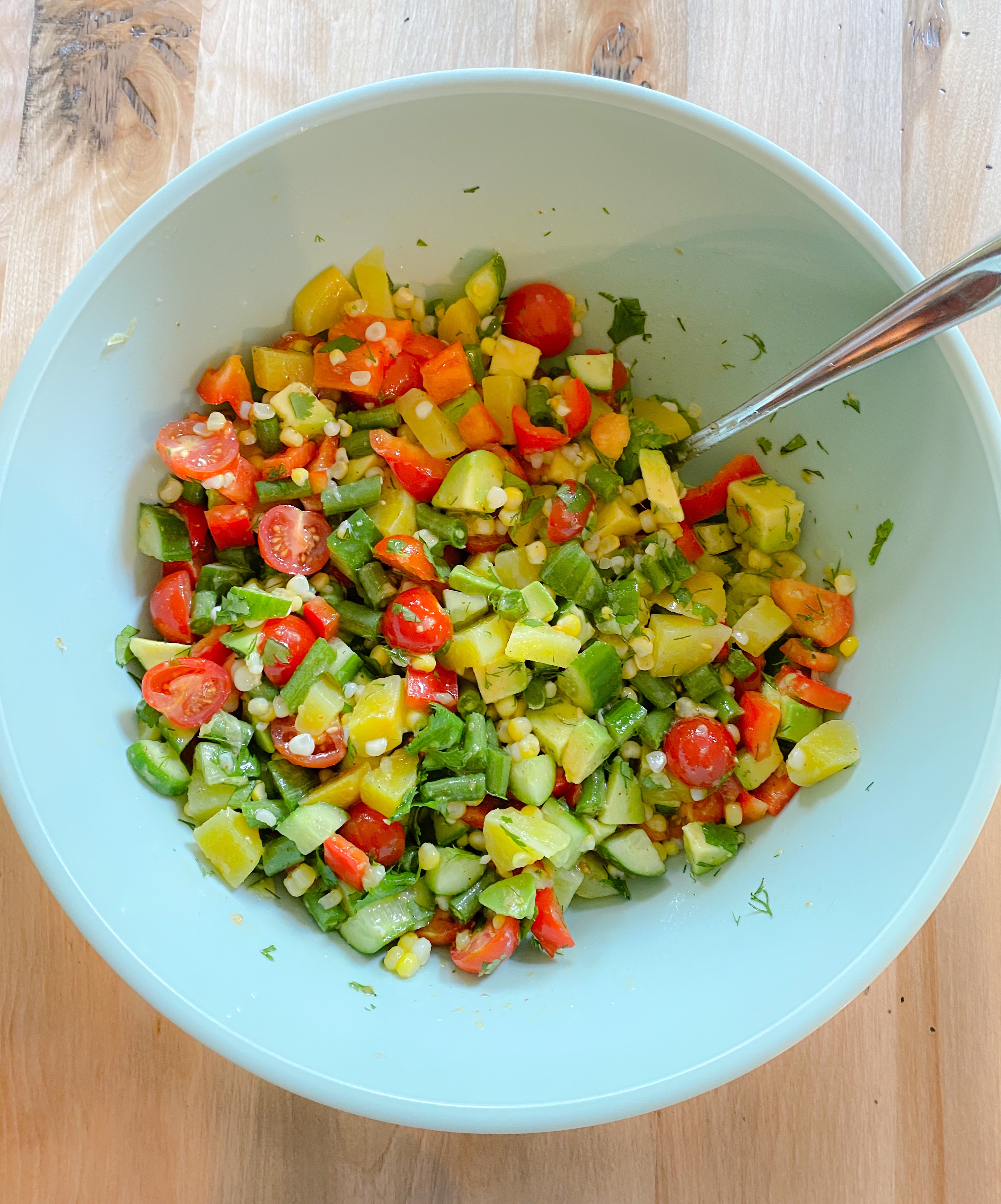 In the summer, I usually make salads topped with some sort of protein for lunch. Come fall and winter, I prefer a warm meal and love bowls filled with a variety of roasted vegetables. But since it’s still summer for a few more weeks, this chopped salad is the perfect way to take advantage of those fresh farmers market or garden vegetables.