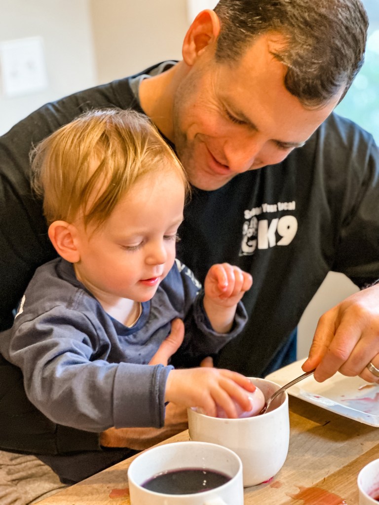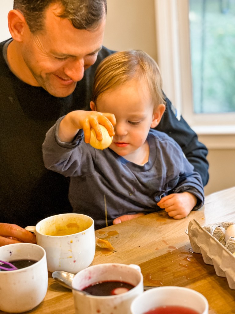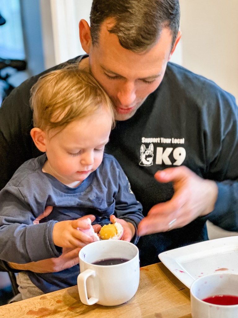 Coloring eggs this year was so much fun! Jackson loves playing in water and had a blast plopping his eggs into each cup, playing in the colored water, breaking a couple eggs and making a mess!